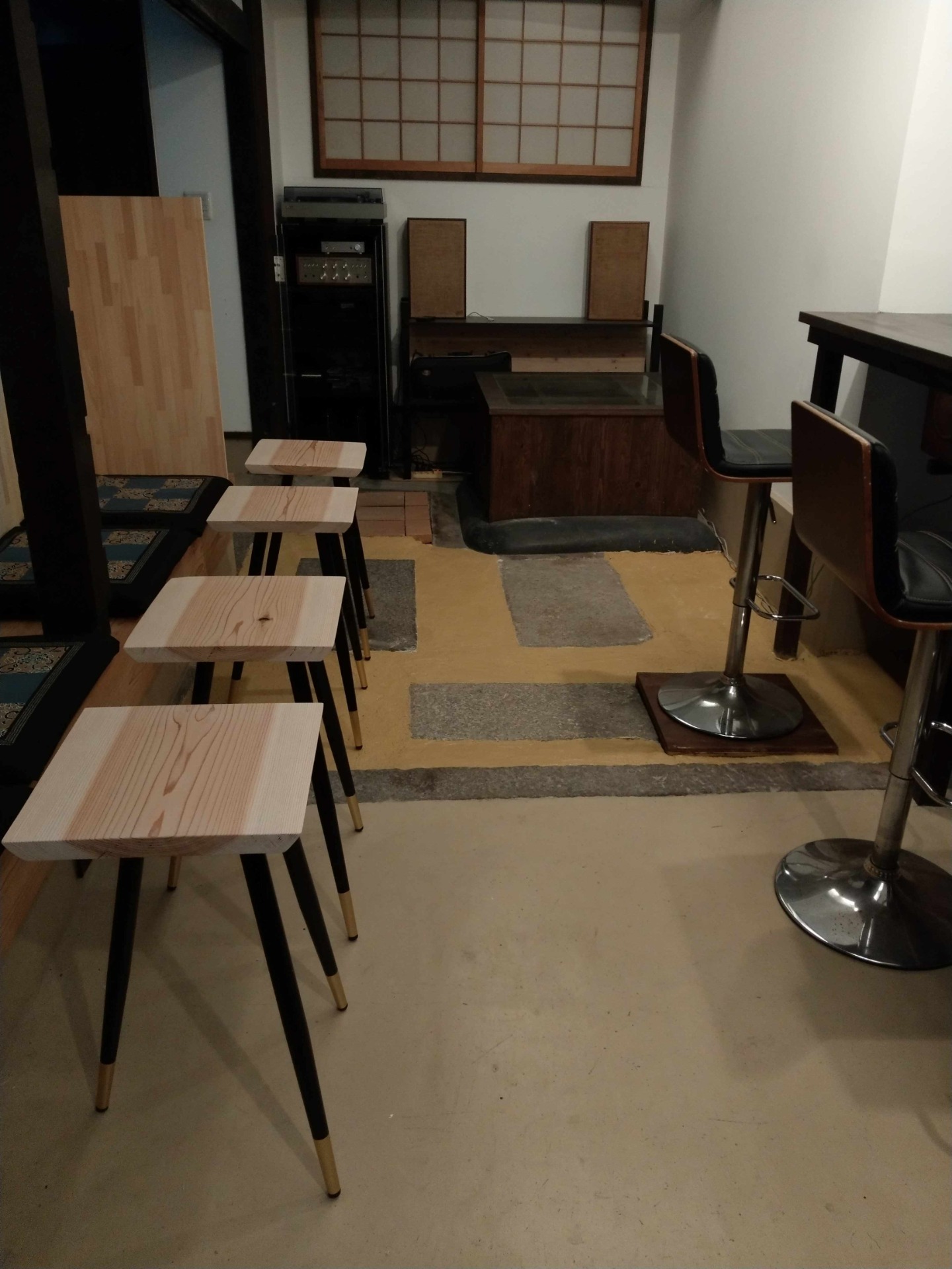 が、もう1点、ずっと気にしつつ、触らないでおこうと思っていたことがありました。土間のでこぼこ部分です。表面のでこぼこもさることながら、平面仕上げの部分の擁壁のように入っている延べ石よりこの部分は4~10cm低くなっています。絵本村でお使いいただいていたときから、段差が危ないとの指摘をいただいていました。そちらは主催者が目立つテープを貼って対応されていました。近所に住む叔母も段差が危ないと指摘していました。こちらとしては、ずっと使っていて慣れているので気にならないものだから、デザインなんですわ・・・で済まそうか、と考えていました。しかし、ほかの造作が一段落して、空間に立って落ち着いてみると、何かしっくりこない。原因はでこぼこ土間の見た目、色だと気づきました。敷石と打ちっぱなし土間コンは、いかにも暗く殺風景であります。安藤忠雄氏のようなおしゃれなコンクリートではありません。自分は慣れているので良いと思っていても、初めて来られるお客様はそうは感じないだろう。まして段差でつまづき怪我でもされたら、と急に心配になりだしました。これも、ずっと割り切ってきたわけではなく、何かうまい方法があればと、頭の片隅では考え続けていました。いっそ工務店に頼んで平面仕上げ部分とレベルを合わせてモルタルできれいにしてもらおうか。しかしそうすると昔からの敷石が全く沈んでしまう。既製品の段差スロープを置く、湿原を渡るような板の橋を渡す、白い玉砂利を敷く(=>歩くとやかましいx)、スーパーボールを敷き詰める、などなど。