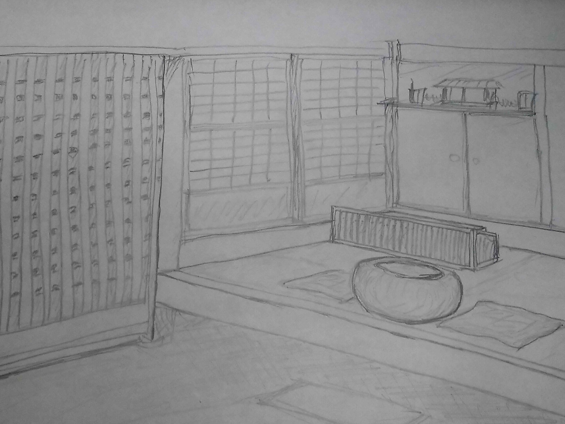 もともとの姿は、通りに面して面格子があり、玄関を入ると土間と右手の店の間が所謂玄関ホールとなっていました。ちょっとしたお客は店の間の上がり框に腰かけてもらい、火鉢をかこんで応対します。店の間の奥には神棚と帳場格子・帳場机が置いてありました。(※イラスト)土間の左手は走りもと(炊事場)であり、格子の建具が入れてありました。これで家人はお客がお茶が必要な人かどうかを確認できたようです。走りもとは、今でいうウェット式の調理場で、土間プラス石畳の上で作業します。給湯器もないし冬は寒かったに違いありません。重要なお客は当たり前ながら廊下を伝って座敷に通します。狭いながら、前栽があり、建具も冬用・夏用を取り換えていました。